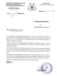 Le gouvernement burkinabè renforce les exigences de transparence et de conformité fiscale au sein de l’administration publique. Désormais, tout candidat à un poste de nomination devra obligatoirement fournir un quitus fiscal valide. Cette mesure a été rappelée dans une correspondance officielle datée du 20 février 2026, signée par le Secrétaire général du ministère de l’Enseignement…