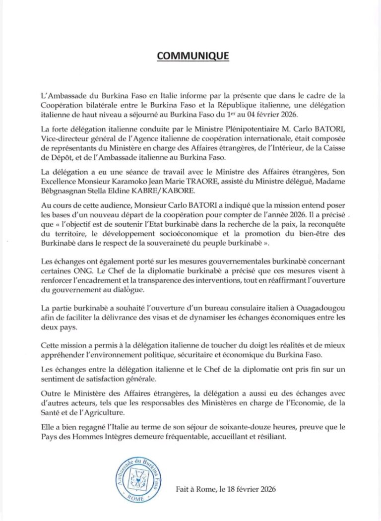 L’Ambassade du Burkina Faso en Italie a annoncé le séjour d’une délégation italienne de haut niveau au Burkina Faso, du 1er au 4 février 2026, dans le cadre du renforcement de la coopération bilatérale entre les deux pays. Cette mission s’inscrit dans une volonté commune d’ouvrir une nouvelle phase de collaboration orientée vers la paix,…