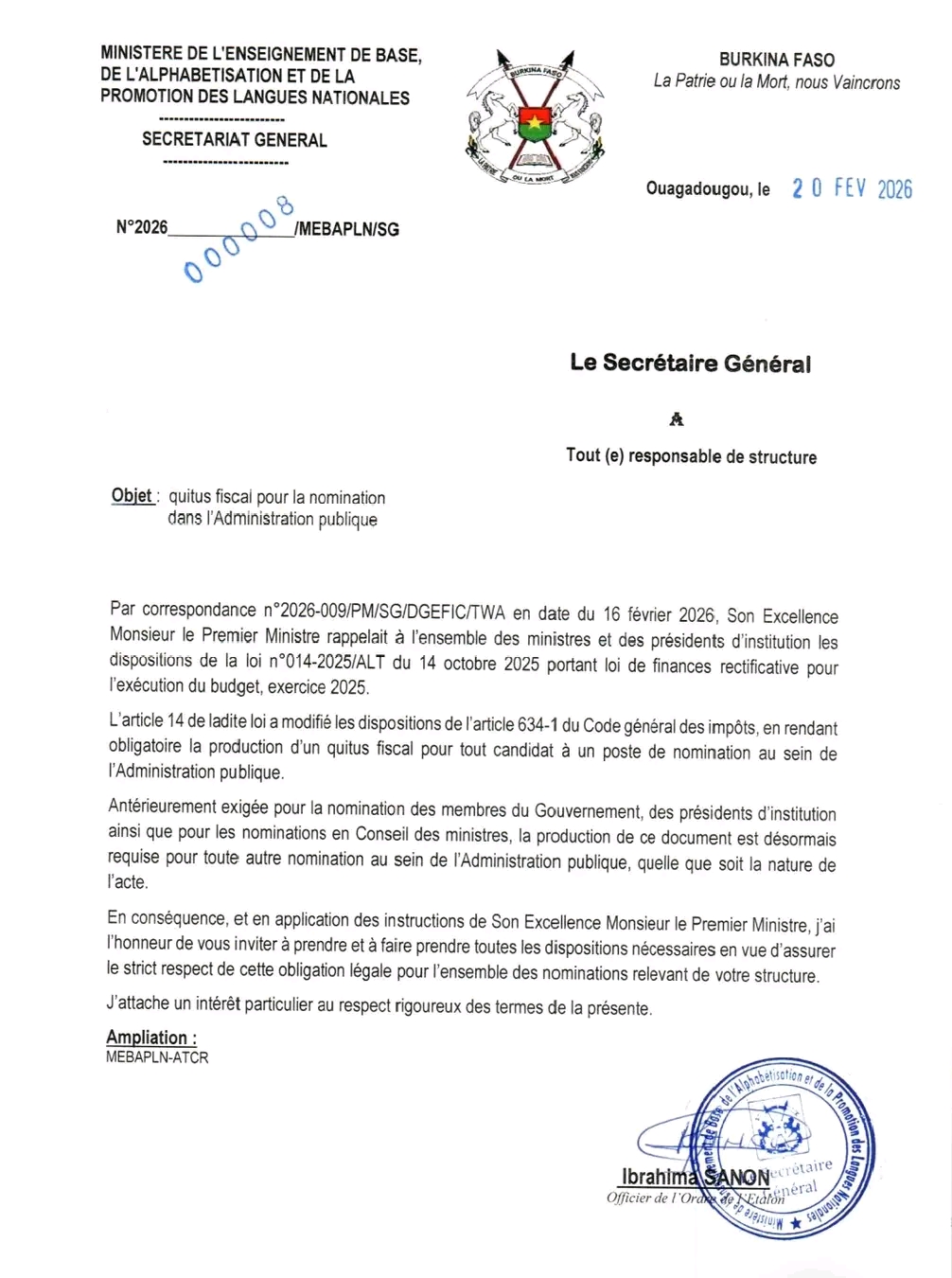 Le gouvernement burkinabè renforce les exigences de transparence et de conformité fiscale au sein de l’administration publique. Désormais, tout candidat à un poste de nomination devra obligatoirement fournir un quitus fiscal valide.