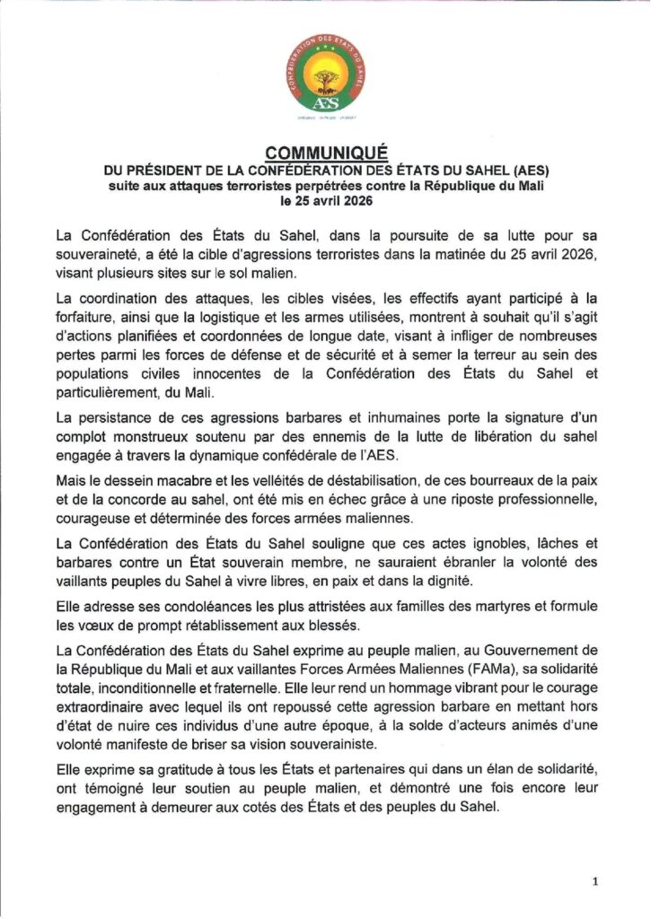 Dans un communiqué officiel signé à Ouagadougou, la Confédération des États du Sahel (AES) réagit aux attaques terroristes du 25 avril 2026 au Mali avec un ton ferme et sans ambiguïté.