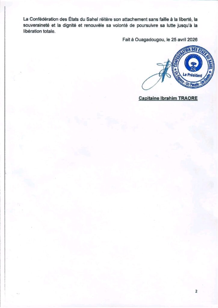Enfin, la Confédération réaffirme son soutien « total, inconditionnel et fraternel » au peuple malien, à son gouvernement et à ses forces armées, tout en renouvelant son engagement à poursuivre la lutte pour la souveraineté et la stabilité du Sahel.