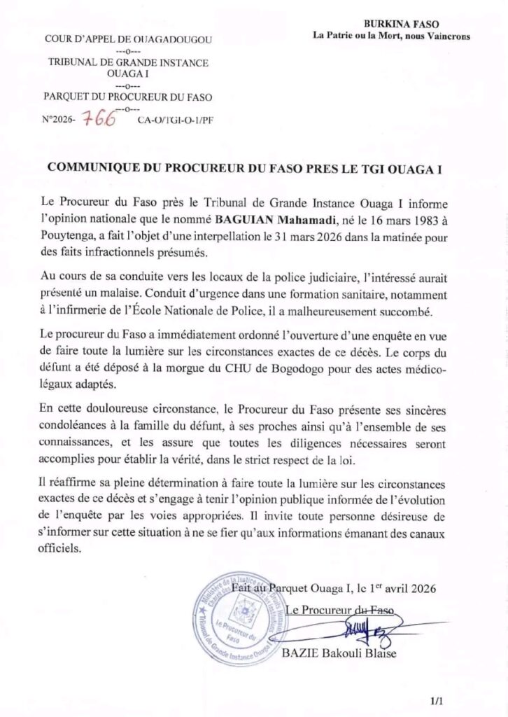 Le Procureur du Faso près le Tribunal de grande instance Ouaga I a annoncé dans un communiqué rendu public ce 1er avril, le décès de Baguian Mahamadi, survenu à la suite de son interpellation le 31 mars 2026 dans la matinée.
