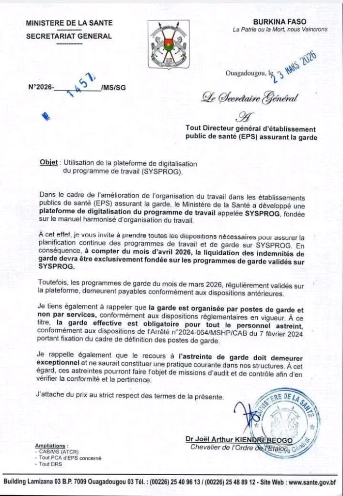 Le ministère de la Santé franchit une nouvelle étape dans l’organisation du travail au sein des établissements publics de santé. À travers une note datée du 23 mars 2026, le Secrétaire général, Joël Arthur Kiendrébéogo, annonce la mise en service d’une plateforme de digitalisation des programmes de travail et de garde, baptisée SYSPROG.