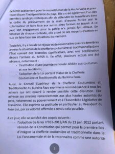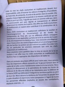 Dans ce document, les chefs coutumiers rappellent que « la chefferie coutumière et traditionnelle est la première organisation de gouvernance des communautés », mettant en avant son ancrage historique et sa légitimité sociale. Ils insistent également sur leur contribution à la préservation de la paix et de l’ordre social.
