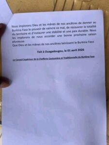 Le Conseil supérieur de la chefferie coutumière et traditionnelle du Burkina Faso a rendu publique ce 1er avril 2026, une déclaration à la Nation, dans laquelle il réaffirme son rôle central dans la cohésion sociale et la stabilité du pays.