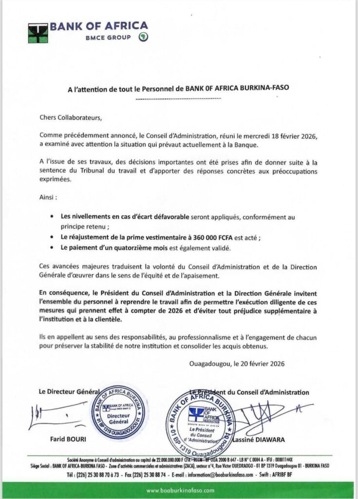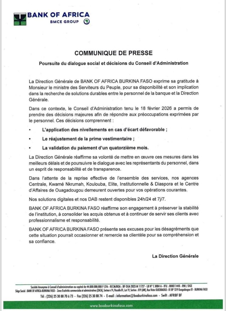 La Direction générale de Bank of Africa Burkina Faso annonce la poursuite du dialogue social au sein de l’institution, à l’issue du Conseil d’administration tenu le 18 février 2026.