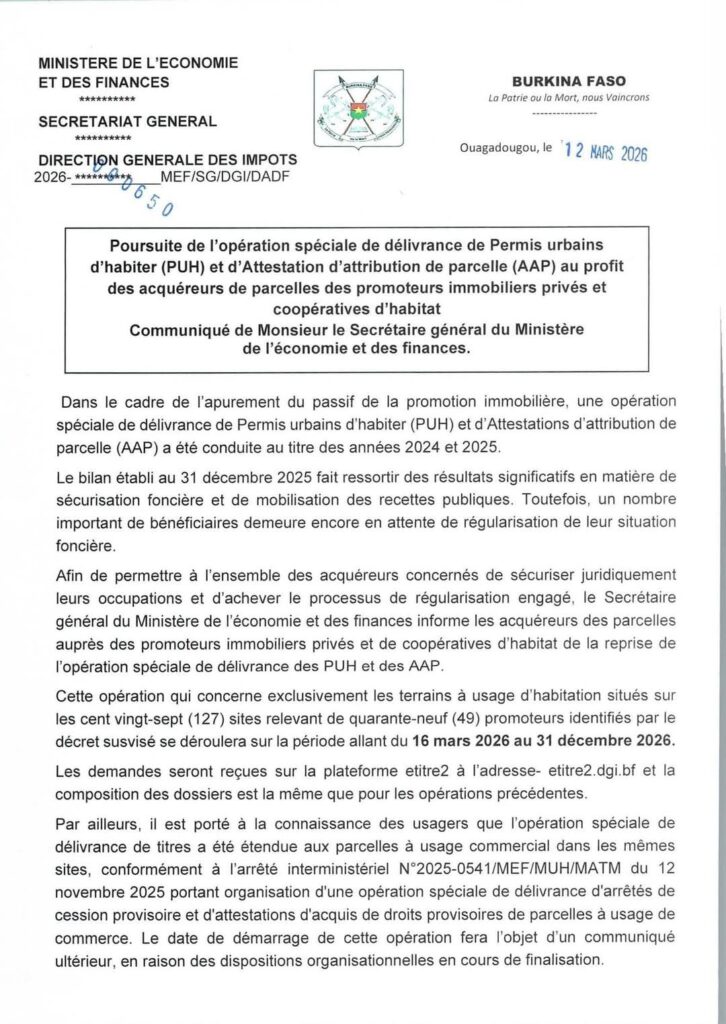 Le gouvernement burkinabè remet sur la table une opération très attendue par de nombreux acquéreurs de terrains. À travers un communiqué officiel signé le 12 mars dernier à Ouagadougou, le ministère de l’Économie et des Finances annonce la reprise de l’opération spéciale de délivrance des Permis urbains d’habiter (PUH) et des Attestations d’attribution de parcelle (AAP).