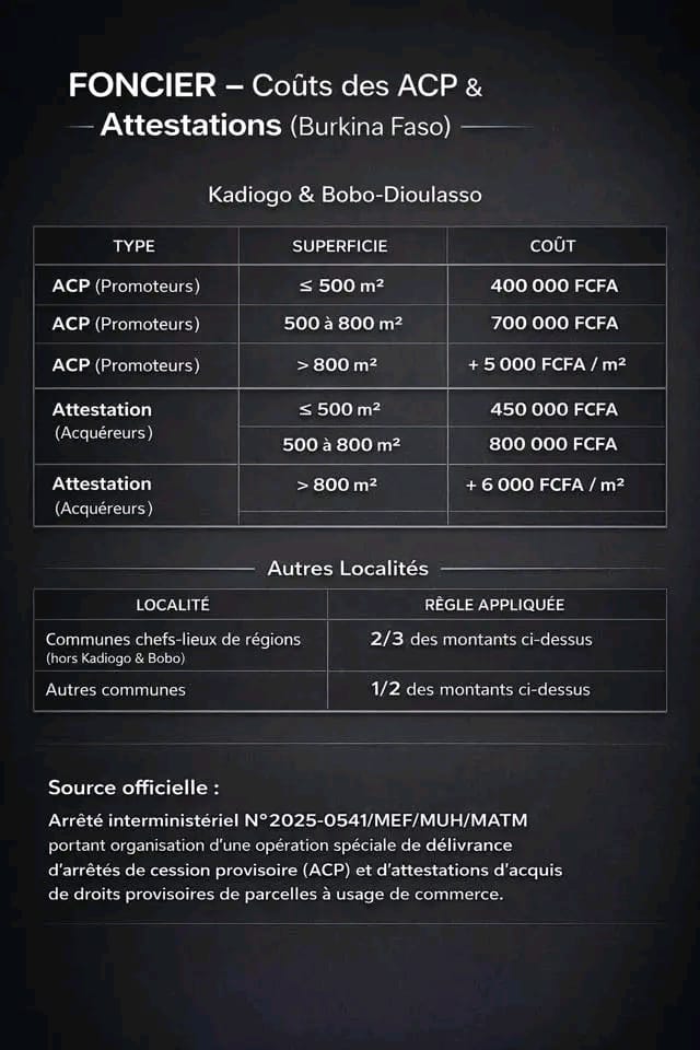 Dans les grandes zones urbaines comme le Kadiogo et Bobo-Dioulasso, les montants sont plus élevés. Pour un terrain bâti, il faut par exemple compter 375 000 FCFA pour une parcelle de 300 m² ou moins, et jusqu’à 600 000 FCFA lorsque la superficie augmente, avec un supplément à payer au-delà de 500 m².Du côté des terrains nus, les tarifs démarrent autour de 300 000 FCFA dans ces mêmes zones, puis évoluent progressivement en fonction de la taille de la parcelle.