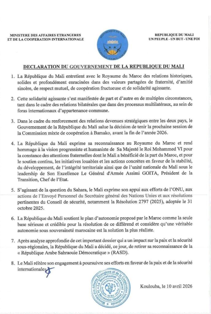 Le ton est posé, mais la décision est lourde de sens. Dans une déclaration publiée le 10 avril 2026, le gouvernement du Mali annonce qu’il retire sa reconnaissance à la République Arabe Sahraouie Démocratique (RASD). Un choix qui marque un virage diplomatique assumé.
